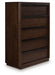 | Details | Made with hardwood solids, mango wood veneer and MDF substrates, Complex, rich dark brown finish, Metal rail pulls with matte black finish, 5 smooth-gliding drawers with fully finished interiors, dovetail construction and heavy-duty ball-bearing side glides (top drawer felt lined), Soft rounded pilasters, Raised plinth base | |