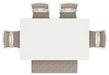 | Details | Includes dining table, 4 chairs and bench, Table made with rubberwood solids, mindi veneer and MDF substrates, Chair and bench made with solid wood frame and engineered wood, White finish, Light gray textured polyester upholstery, Foam seat and back cushions, Chair with adjustable levelers; backrest with fretwork accent, Tapered legs, Seats up to 6, Assembly required | |