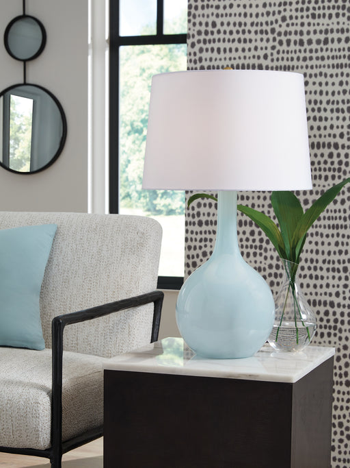 More than mere lighting, this spectacular table lamp illuminates your good taste. Its elegant silhouette, crafted from aqua blue glass, is contempo...