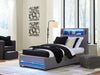 | Details | Includes upholstered headboard, footboard, rails and roll slats, Made with engineered wood frames, solid wood components and foam, Polyester upholstery, Multicolored ambient LED lighting in headboard and lower footboard rail, LED reading light with articulating arm on each side of bed, Bed does not require additional foundation/box spring; accommodates most zero clearance adjustable bases, Mattress available, sold separately, Power cord included; UL Listed, Assembly required | |