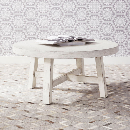 Accent your space with the Modern Farmhouse splay leg round cocktail table. Crafted of poplar solids with knotty oak veneers, this piece features a...