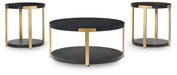 Details Includes coffee table and 2 end tables, Made with melamine laminate top and MDF substrates, Textural black wood grain pattern, Metal legs with durable goldtone powder coat finish, Lower display shelf, Coffee table with casters for easy mobility