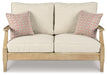 An effortlessly elegant choice in outdoor furniture, this outdoor loveseat marries sturdiness and style in such a delightful way. For that much more weather protection, the loveseat’s eucalyptus wood frame with tapered touches and slat styling is treated to a 5-step finishing process. Sumptuously soft yet remarkably durable, the included cushions and colorful throw pillows are wrapped in a high-performing, low-maintenance Nuvella® fabric you’re sure to love.