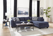 Add a bold splash of color and comfort to your space with this denim-blue sectional. With a classic silhouette and fun mix of patterned pillows, it’s relaxed but never boring. Made for casual hangs and stylish lounging.Deep navy denim-style upholstery with a durable weave
