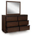 | Details | Made with hardwood solids, mango wood veneer and MDF substrates , Complex, rich dark brown finish, Full-length metal rail pulls with matte black finish, 6 smooth-gliding drawers with fully finished interiors, dovetail construction and heavy-duty ball-bearing side glides (top drawers felt lined), Mirror attaches to back of dresser, Soft rounded pilasters, Raised plinth base | |