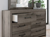 | Details | Includes dresser and mirror, Made with engineered wood (MDF/particleboard/plywood) and decorative laminate for the right balance of affordability and durability , Weathered gray finish over replicated oak grain, Decorative laminate replicates natural or man-made material surfaces with consistent color, pattern and texture, Large-scale dark colored handles, 6 smooth-gliding drawers, Drawer interiors are lined with a faux linen laminate for a clean, finished look , Safety is a top priority, clothing storage units are designed to meet the most current standard for stability, ASTM F 2057 (ASTM International), Drawers extend out to accommodate maximum access to drawer interior while maintaining safety, Mirror attaches to back of dresser; can also be mounted on wall horizontally or vertically , Minor assembly required | |