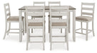 | Details | Includes counter height dining table and 6 counter height bar stools, Table made with hardwood solids, acacia veneer and MDF substrate, Stools made with solid wood frames, Grayish white finish with rub through effect, Table top with brown wood-tone finish, Polyester upholstery, Foam cushioned seats, Assembly required | |